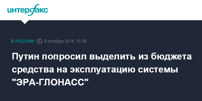 Москва. 8 октября. INTERFAX.RU - Президент РФ Владимир Путин просит правительство изыскать деньги на эксплуатацию и содержание в 2015-2016 годах системы "ЭРА-ГЛОНАСС".