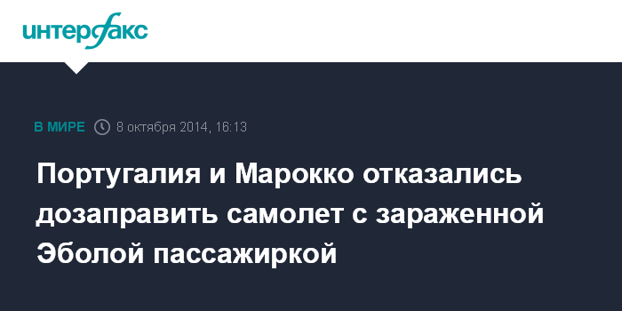 Москва. 8 октября. INTERFAX.RU - Власти Португалии и Марокко отказались принять на дозаправку в своих аэропортах самолет, на борту которого находилась медработница, заразившаяся вирусом Эбола в Сьерра-Леоне.