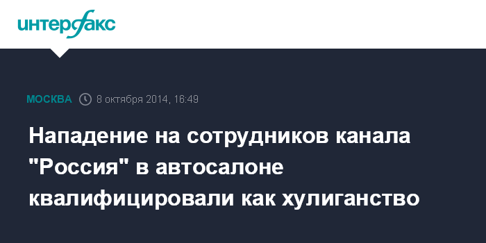Москва. 8 октября. INTERFAX.RU - Уголовное дело о хулиганстве возбуждено в связи нападением на съемочную группу телеканала "Россия" в автосалоне на востоке Москвы, сообщается на сайте прокуратуры столицы.