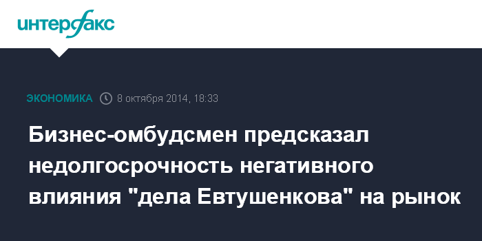 Москва. 8 октября. INTERFAX.RU - Бизнес-омбудсмен Борис Титов не прогнозирует долгосрочного негативного влияния на рынок из-за "дела Евтушенкова", если оно связано с нарушениями по приватизации одной-единственной компании.
