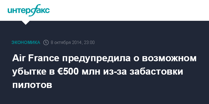 Москва. 8 октября. INTERFAX.RU - Авиакомпания Air France по итогам года может потерять до €500 млн из-за забастовки пилотов в сентябре. Об этом сообщается в пресс-релизе на сайте организации.