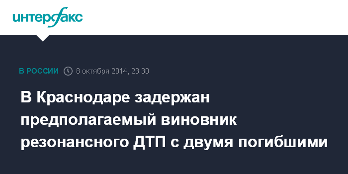 Москва. 8 октября. INTERFAX.RU - Полиция в среду вечером задержала предполагаемого виновника резонансного ДТП на автобусной остановке Краснодара, унесшего жизни двух человек. Об этом "Интерфаксу" сообщил представитель УМВД по городу Артем Коноваленко.
