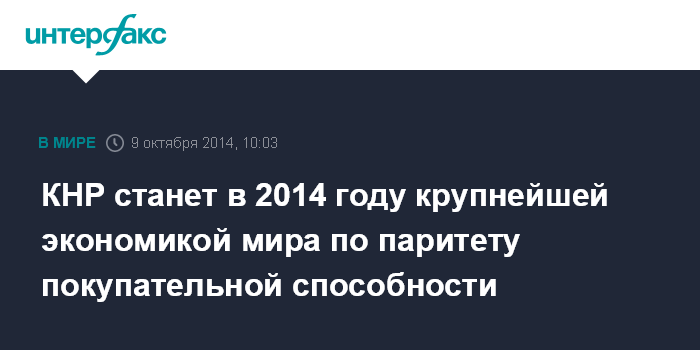 Москва. 9 октября. INTERFAX.RU - Китай официально станет в этом году крупнейшей мировой экономикой, опередив США по объему ВВП, измеряемому по паритету покупательной способности, пишет The Financial Times со ссылкой на данные Международного валютного фонда (МВФ).