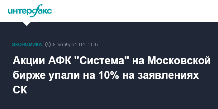 Москва. 9 октября. INTERFAX.RU - Акции АФК "Система" и "Башнефти" резко провалились вниз на заявлениях Следственного комитета (СК) РФ о необходимости взыскать с "Системы" денежный штраф в пользу государства.