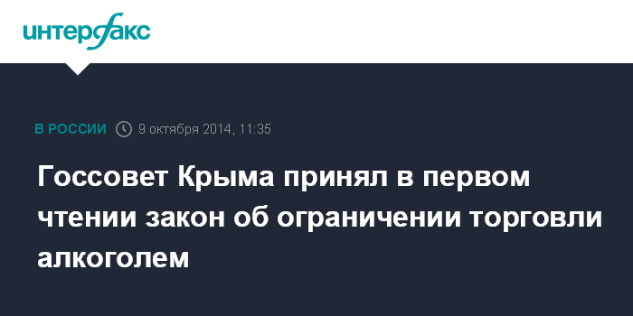 Москва. 9 октября. INTERFAX.RU - Государственный совет Крыма в четверг принял в первом чтении закон об ограничении торговли алкоголем на территории республики, передает корреспондент "Интерфакса".