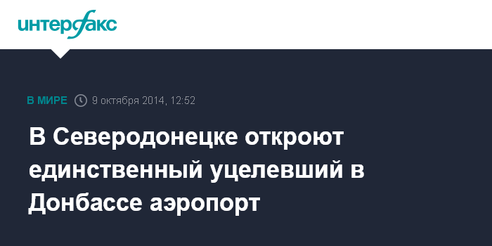 Москва. 9 октября. INTERFAX.RU - В Северодонецке (Луганская область) откроют единственный уцелевший в Донбассе аэропорт, сообщает пресс-служба главы Луганской областной государственной администрации (ОГА).