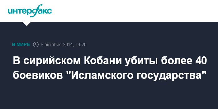 Москва. 9 октября. INTERFAX.RU - В сирийском городе Кобани 8 октября были убиты по меньшей мере 42 экстремиста из "Исламского государства" (ИГ), сообщил Наблюдательный совет по правам человека в Сирии.