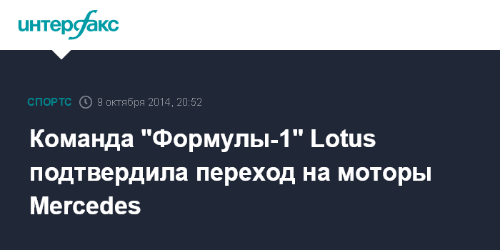 Москва. 9 октября. INTERFAX.RU - Lotus F1 Team подтвердила, что начиная с сезона-2015 будет использовать моторы Mercedes, сообщает Sky Sports.