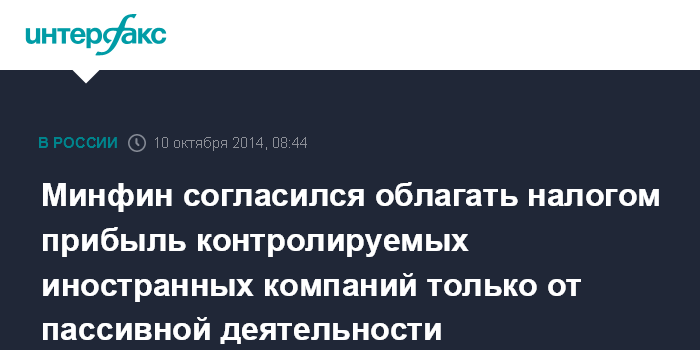 Вашингтон. 10 октября. ИНТЕРФАКС-АФИ - Минфин согласился с предложением бизнеса распространить действие закона о контролируемых иностранных компаниях (КИК) в части налогообложения только на прибыль КИК от пассивной деятельности, сообщил журналистам министр финансов РФ Антон Силуанов.