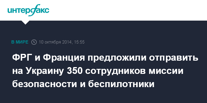Москва. 10 октября. INTERFAX.RU - Украинская сторона получила предложения относительно отправки Германией и Францией беспилотных летательных аппаратов и сотрудников миссии безопасности в восточные регионы страны, сообщил агентству "Интерфакс" информированный источник.