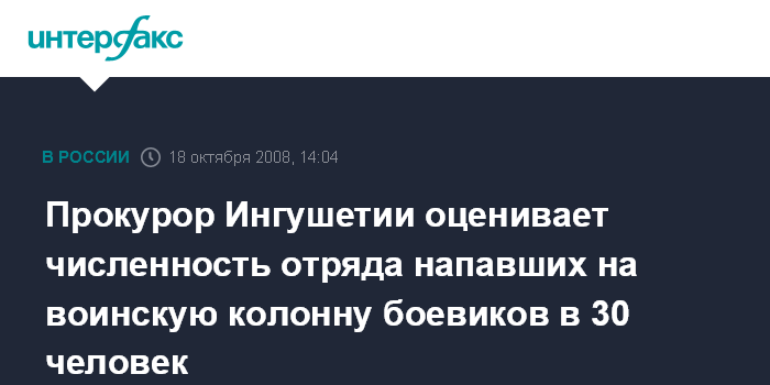 Москва. 18 октября. INTERFAX.RU - В нападении на войсковую колонну в Ингушетии участвовали до 30 боевиков, заявил прокурор республики Юрий Турыгин.