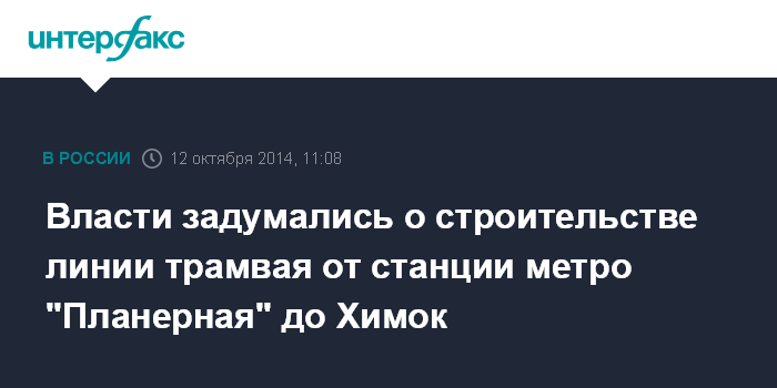 Москва. 12 октября. INTERFAX.RU - Правительства столицы и Московской области прорабатывают возможности строительства линии трамвая от станции метро "Планерная" в подмосковные Химки, сообщил первый замначальника дирекции строящегося метрополитена ГУП "Московский метрополитен" Владимир Моисеев журналистам.