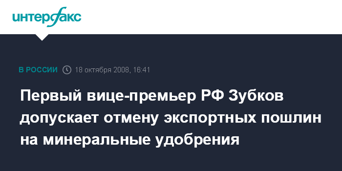 Москва. 18 октября. INTERFAX.RU - Правительство РФ не будет настаивать на сохранении экспортной пошлины на минеральные удобрения в случае эффективной работы соглашения об обеспечении производителей удобрений, заключенного накануне отраслевыми ассоциациями. Такое мнение высказал в субботу журналистам первый вице-премьер Виктор Зубков по итогам консультаций с банками о первоочередных мерах для стабилизации финансирования АПК.