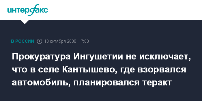 Москва. 18 октября. INTERFAX.RU - Взрывное устройство, которое сработало в субботу в селе Кантышево в Ингушетии, предназначалось для организации крупного теракта, считают в республиканской прокуратуре.