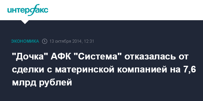 Москва. 13 октября. INTERFAX.RU - ОАО "Система Финанс Инвестментс" не стало завершать сделку по приобретению 1,69% акций ее материнской компании АФК "Система". Соглашение о сделке было подписано 11 июля, ее сумма должна была составить 7,6 млрд рублей.