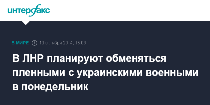 Москва. 13 октября. INTERFAX.RU - Обмен пленными между силами ополчения самопровозглашенной Луганской народной республики и украинской армией может произойти в понедельник.