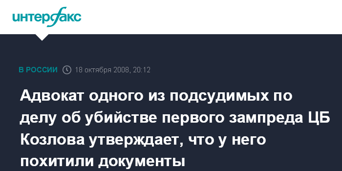 Москва. 18 октября. ИНТЕРФАКС - Документы, касающиеся дела об убийстве первого зампреда ЦБ РФ Андрея Козлова, были похищены в субботу утром у адвоката одного из подсудимых.