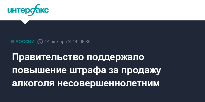 Москва. 14 октября. INTERFAX.RU - Правительство РФ рассмотрело и поддержало законопроект о повышении минимального штрафа за продажу алкоголя несовершеннолетним. Об этом говорится в сообщении на сайте правительства.