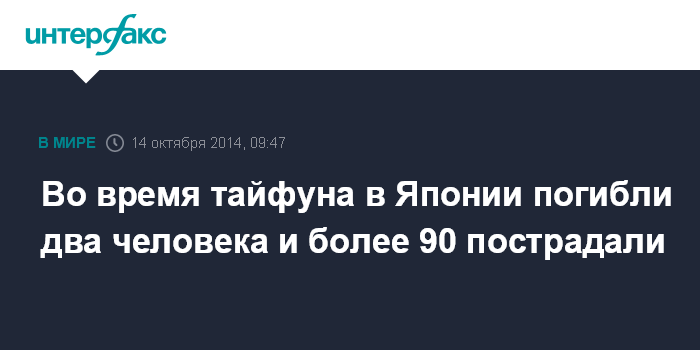 Москва. 14 октября. INTERFAX.RU - Два человека погибли и более 90 получили ранения в результате удара тайфуна "Вонгфонг" по территории Японии, сообщает японский телеканал NHK.