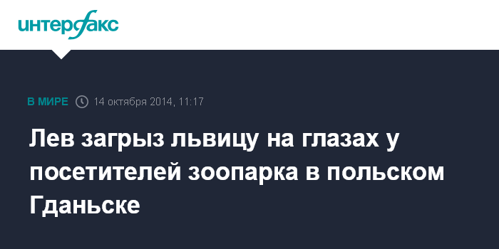 Москва. 14 октября. INTERFAX.RU - В Оливском зоопарке в польском Гданьске молодой лев загрыз львицу, сообщают во вторник местные СМИ. Инцидент произошел накануне днем. На глазах у посетителей зоопарка лев вдруг набросился на самую молодую из трех самок и задушил ее.
