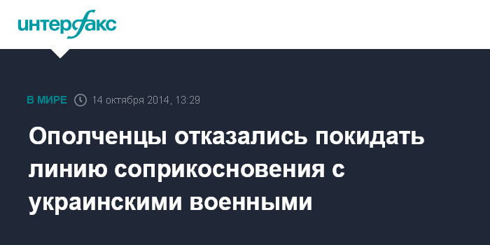 Москва. 14 октября. INTERFAX.RU - Ополченцы самопровозглашенной Донецкой народной республики отказались отводить свои формирования от линии соприкосновения с украинскими военными до вывода Киевом своих подразделений с территории Донбасса.