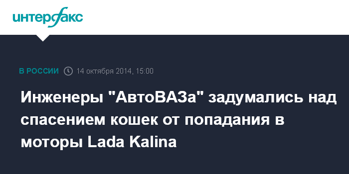 Москва. 14 октября. INTERFAX.RU - Спасатели Тольятти проинформировали "АвтоВАЗ" об участившихся обращениях владельцев Lada Kalina с просьбами вызволить из-под капота машин застрявших там кошек. В компании обещали внимательно изучить эту информацию.