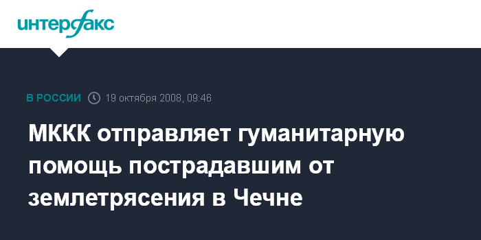 Москва. 19 октября. INTERFAX.RU - Международный комитет Красного Креста (МККК) направил гуманитарную помощь в несколько сел Чечни, которые пострадали в прошлые выходные из-за землетрясения.