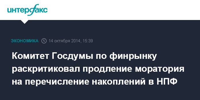 Москва. 14 октября. INTERFAX.RU - Продление моратория на перечисление пенсионных накоплений в негосударственные пенсионные фонды требует дополнительного обсуждения, поскольку может негативно воздействовать на развитие негосударственного пенсионного обеспечения, говорится в заключении комитета Госдумы по финансовому рынку на соответствующий законопроект правительства.