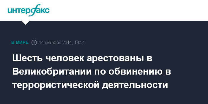 Москва. 14 октября. INTERFAX.RU - Полиция Великобритании арестовала шестерых человек - в Лондоне, Фарнборо и Портсмуте - по обвинению в участии в террористической деятельности, связанной с конфликтом в Сирии, сообщает во вторник The Guardian.