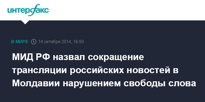 Москва. 14 октября. INTERFAX.RU - В МИД РФ назвали политическим цензурированием и грубейшим нарушением права на свободу слова решение властей Молдавии о применении санкций в отношении местных телеканалов, которые транслировали российские новостные программы.