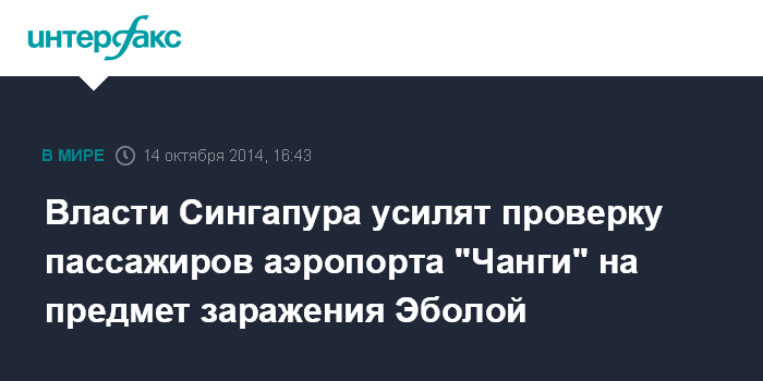 Москва. 14 октября. INTERFAX.RU - Власти Сингапура усилят проверки в международном аэропорту "Чанги" из-за вспышки вируса Эбола, заявили во вторник в Минздраве этой страны.