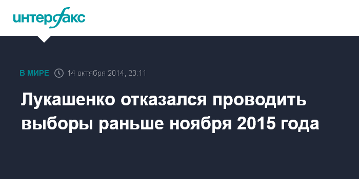 Москва. 14 октября. INTERFAX.RU - Президент Белоруссии Александр Лукашенко не одобряет идею проведения выборов президента раньше ноября 2015 года. Об этом сообщает пресс-служба главы государства.