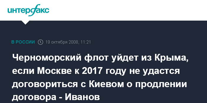 Москва. 19 октября. INTERFAX.RU - Россия будет добиваться продления пребывания Черноморского флота в Севастополе, но, если после 2017 года Киев не продлит с РФ договор аренды, Черноморский флот покинет Крым, заявляет вице-премьер РФ Сергей Иванов.