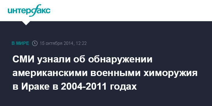 Москва. 15 октября. INTERFAX.RU - Солдаты армии США в период с 2004 по 2011 год обнаружили в Ираке около 5 тысяч единиц химического оружия, однако Пентагон не стал предавать это огласке, сообщает в среду New York Times.