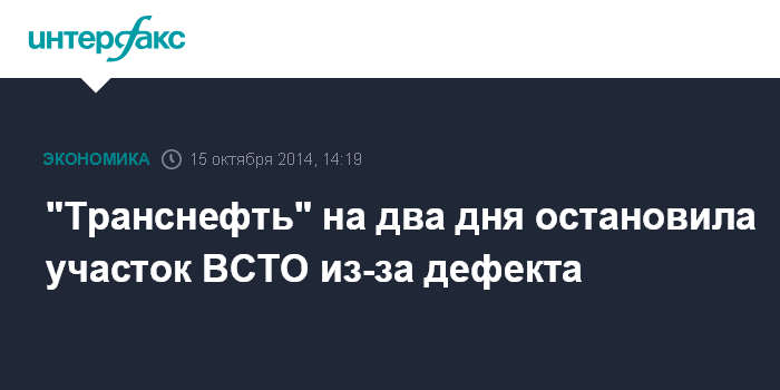 Москва. 15 октября. INTERFAX.RU - "Транснефть" в связи с технологическими работами по устранению дефекта трубы приостановила прокачку нефти до 17 октября на участке Талакан-Сковородино магистрального нефтепровода Восточная Сибирь - Тихий океан (ВСТО).
