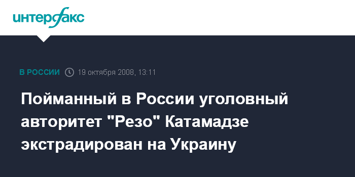 Киев. 19 октября. INTERFAX.RU - Уголовный авторитет Реваз Катамадзе, объявленный Украиной в международный розыск и задержанный в Краснодарском крае РФ, экстрадирован в Киев, сообщает пресс-служба Главного управления по борьбе с организованной преступностью МВД Украины.