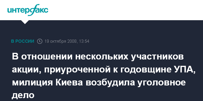 Киев. 19 октября. INTERFAX.RU - Милиция возбудила уголовное дело по факту хулиганских действий восьми участников акции, приуроченной к годовщине основания Украинской повстанческой армии.