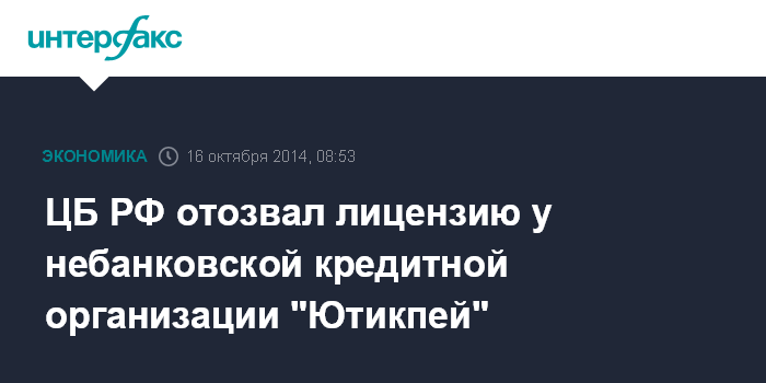 ЦБ РФ отозвал лицензию у небанковской кредитной организации "Ютикпей"