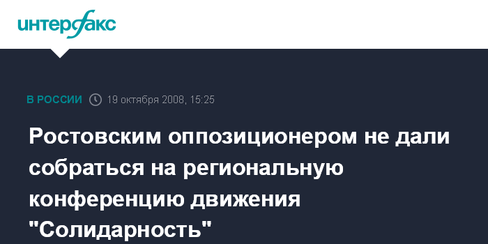 Москва. 19 октября. INTERFAX.RU - Движению под рабочим названием "Солидарность", которое создается рядом известных российских оппозиционных политиков, в воскресенье не удалось провести региональную конференцию в Ростове-на-Дону.