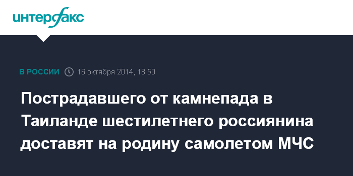 Москва. 16 октября. INTERFAX.RU - МЧС России направляет самолет в Таиланд за шестилетним мальчиком Александром Бакиевым, пострадавшим во время камнепада, сообщил "Интерфаксу" в четверг официальный представитель ведомства Александр Дробышевский.