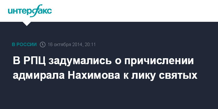 Москва. 16 октября. INTERFAX.RU - У Русской православной церкви может появиться еще один святой - адмирал Павел Нахимов. Вопрос о возможности канонизации знаменитого флотоводца, уроженца Смоленской области, поднял епископ Смоленский и Вяземский Исидор, который в четверг прибыл в Севастополь для обсуждения этого вопроса, сообщает пресс-служба Севастопольского благочиния Симферопольской и Крымской епархии Украинской православной церкви Московского патриархата.