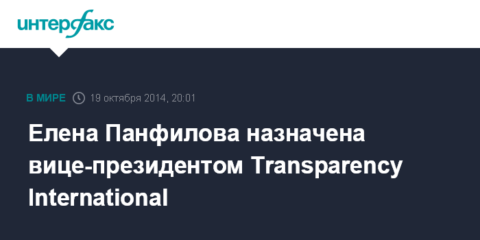 Москва. 19 октября. INTERFAX.RU - Директор Центра антикоррупционных исследований и инициатив "Трансперенси Интернешнл-Россия" Елена Панфилова стала вице-президентом международной Transparency International, говорится в сообщении этой организации в твиттере.