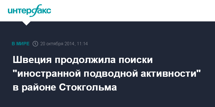 Москва. 20 октября. INTERFAX.RU - Шведские военные в понедельник продолжают поиски "иностранной подводной активности" в море в районе Стокгольма, однако не спешат с выводами о том, какой именно объект может находиться в их водах, передает телеканал Euronews.