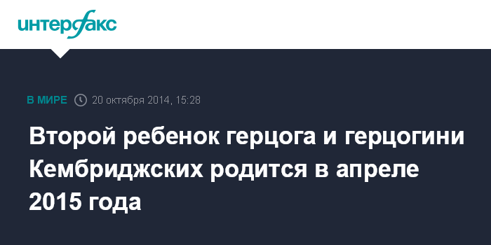 Москва. 20 октября. INTERFAX.RU - Второй ребенок герцога и герцогини Кембриджских Уильяма и Кейт появится на свет в апреле 2015 года, говорится в заявлении Кенсингтонского дворца, распространенном в понедельник.
