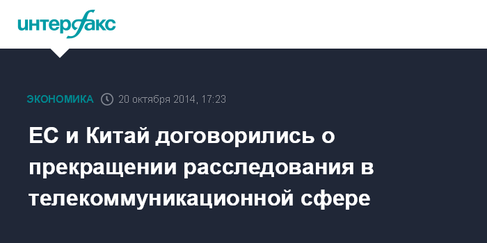 Москва. 20 октября. INTERFAX.RU -Европейский союз и Китай достигли соглашения о прекращении расследования в отношении китайских телекоммуникационных компаний, которые подозревались в получении субсидий от китайского правительства, сообщается на сайте Еврокомиссии.