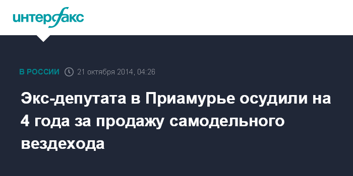 Москва. 21 октября. INTERFAX.RU - Бывший депутат Благовещенской городской думы Сергей Жеребцов приговорен к четырем годам колонии за продажу самодельного вездехода по поддельным документам. Об этом сообщает региональная прокуратура.