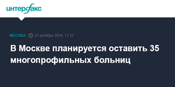 Москва. 21 октября. INTERFAX.RU - Точное количество многопрофильных больниц, которые останутся в результате изменений в столичном здравоохранении, будет известно к концу 2016 года, в настоящее время предполагается, что их будет 35, заявил заммэра столицы Леонид Печатников.