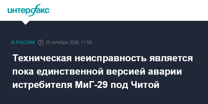 Москва. 20 октября. INTERFAX.RU – Истребитель МиГ-29, разбившийся на прошлой неделе в Забайкальском крае, упал по техническим причинам и другой версии на сегодня пока нет, сообщил агентству "Интерфакс-Сибирь" начальник военно-следственного отдела по гарнизону "Дровяная" Андрей Сапожников.