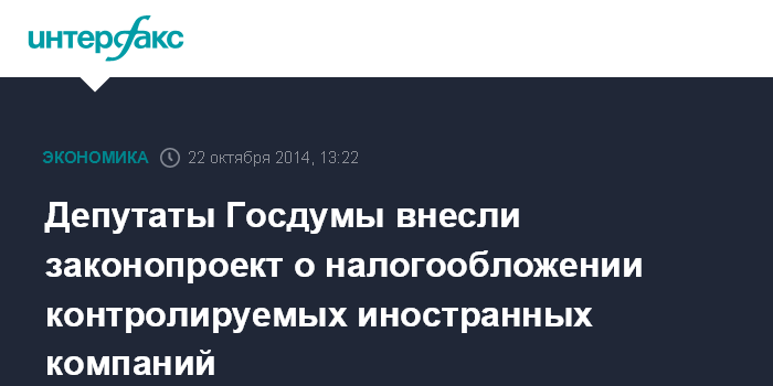 Москва. 22 октября. INTERFAX.RU - Депутаты Госдумы внесли на рассмотрение нижней палаты парламента законопроект, определяющий механизм налогообложения прибыли контролируемых иностранных компаний (КИК) и доходов иностранных организаций.
