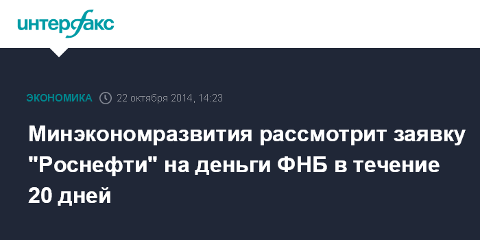 Москва. 22 октября. INTERFAX.RU - Заявка "Роснефти" на получение средств Фонда национального благосостояния поступила в Минэкономразвития 21 октября. Как сообщил "Интерфаксу" представитель министерства, срок ее рассмотрения - 20 дней.